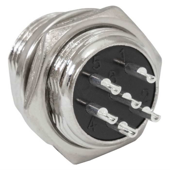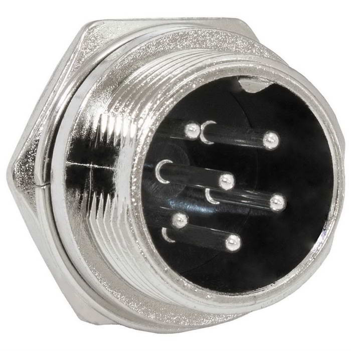 Разъём цилиндрический малогабаритный RUICHI GX16M-6B, 6 контактов представляет собой коннектор ручного соединения, внутреннего объемного монтажа. Он соединяет цепи с нагрузкой до 10 А и 200 В. Корпус соединителей изготовляется из цинка и никеля, а внутренний изолятор из бакелита. Разъемы являются пылезащищенными и соответствуют степени защиты IP 55, что гарантирует работу в пыльной среде и допускает попадания брызг воды.