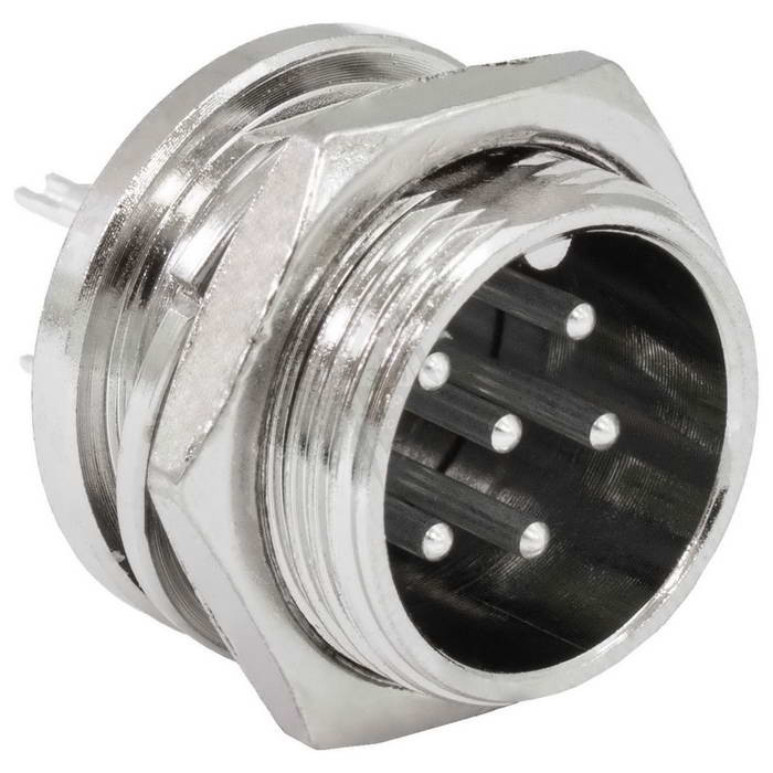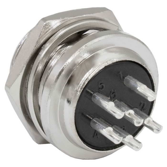 Разъём цилиндрический малогабаритный RUICHI GX16M-6C, 6 контактов представляет собой коннектор ручного соединения, внутреннего объемного монтажа. Он соединяет цепи с нагрузкой до 10 А и 200 В. Корпус соединителей изготовляется из цинка и никеля, а внутренний изолятор из бакелита. Разъемы являются пылезащищенными и соответствуют степени защиты IP 55, что гарантирует работу в пыльной среде и допускает попадания брызг воды.