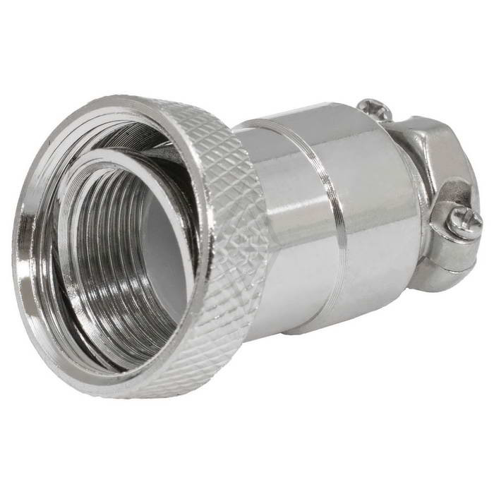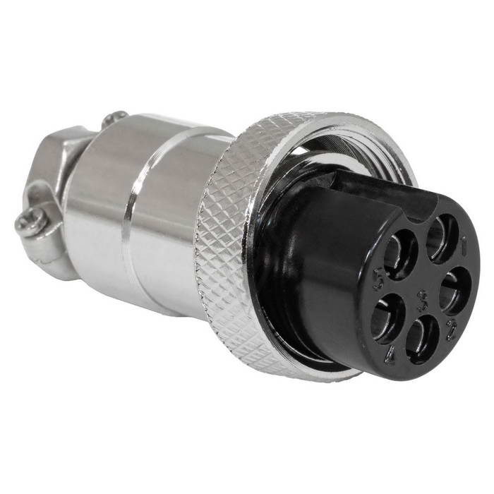 Разъём цилиндрический малогабаритный RUICHI GX20M-5A, 5 контактов представляет собой коннектор ручного соединения, внутреннего объемного монтажа. Он соединяет цепи с нагрузкой до 10 А и 200 В. Корпус соединителей изготовляется из цинка и никеля, а внутренний изолятор из бакелита. Разъемы являются пылезащищенными и соответствуют степени защиты IP 55, что гарантирует работу в пыльной среде и допускает попадания брызг воды.