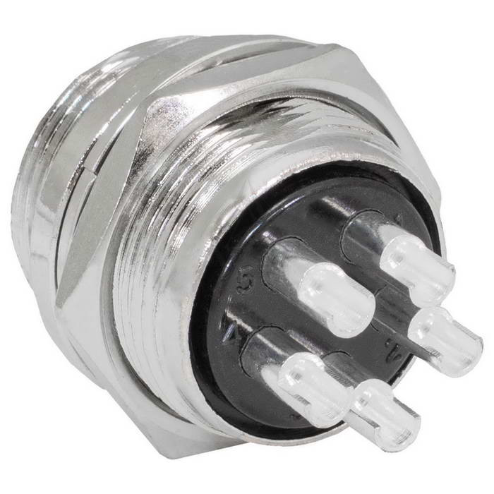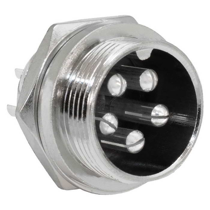 Разъём цилиндрический малогабаритный SZC GX20M-5B, 5 контактов представляет собой коннектор ручного соединения, внутреннего объемного монтажа. Он соединяет цепи с нагрузкой до 10 А и 200 В. Корпус соединителей изготовляется из цинка и никеля, а внутренний изолятор из бакелита. Разъемы являются пылезащищенными и соответствуют степени защиты IP 55, что гарантирует работу в пыльной среде и допускает попадания брызг воды.