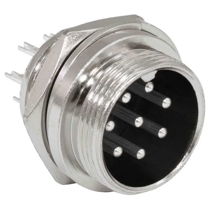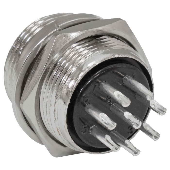 Разъём цилиндрический малогабаритный SZC GX20M-8B, 8 контактов представляет собой коннектор ручного соединения, внутреннего объемного монтажа. Он соединяет цепи с нагрузкой до 10 А и 200 В. Корпус соединителей изготовляется из цинка и никеля, а внутренний изолятор из бакелита. Разъемы являются пылезащищенными и соответствуют степени защиты IP 55, что гарантирует работу в пыльной среде и допускает попадания брызг воды.