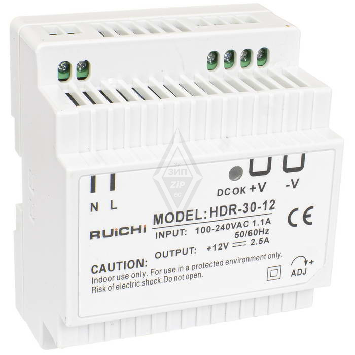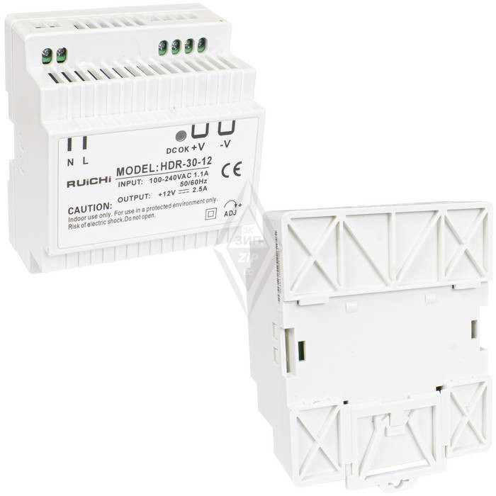 Блок питания на DIN-рейку RUICHI HDR-30-12, 85-266 В (АС) 2.5 А, 12 В, в пластиковым корпусе представляет собой преобразователь из напряжения переменного тока (AC) в напряжение постоянного тока (DC) большой мощности модульного типа. Отличительными особенностями импульсных блоков питания на на DIN-рейку является, высокая мощность и отказоустойчивость, и широкий диапазон рабочей температуры - от -30 до +70 °С.