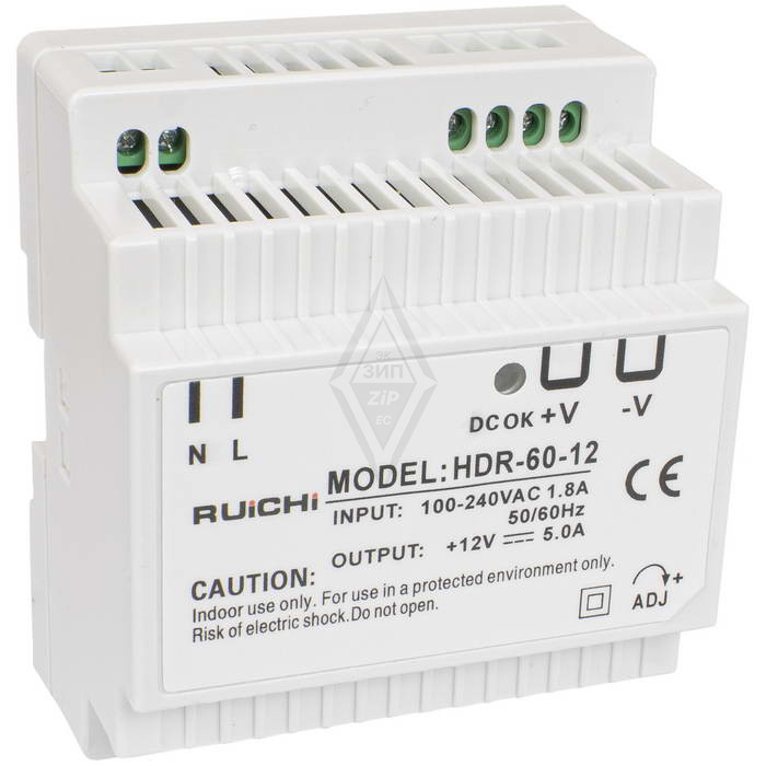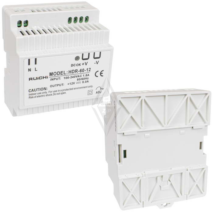 Блок питания на DIN-рейку RUICHI HDR-60-12, 85-266 В (АС) 5 А, 12 В, в пластиковым корпусе представляет собой преобразователь из напряжения переменного тока (AC) в напряжение постоянного тока (DC) большой мощности модульного типа. Отличительными особенностями импульсных блоков питания на на DIN-рейку является, высокая мощность и отказоустойчивость, и широкий диапазон рабочей температуры - от -30 до +70 °С.