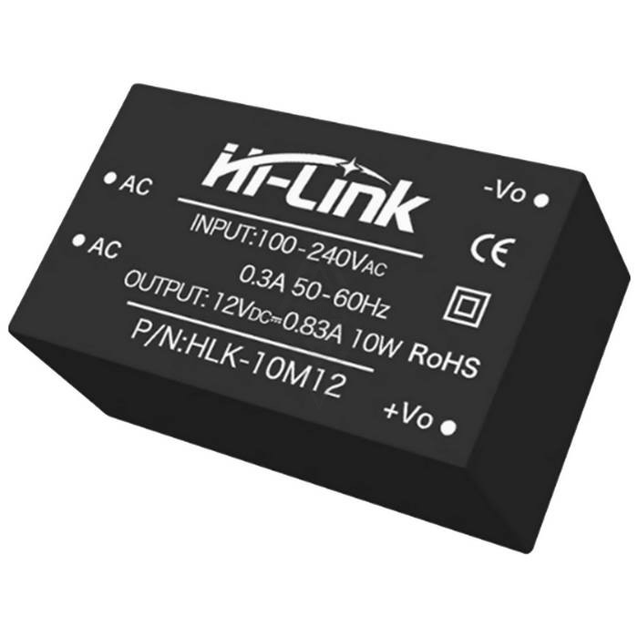 Блок питания на печатную плату Hi-Link HLK-10M12, 85-264 В (АС) 0.83 А, 12 В, корпус из поликарбоната представляет собой преобразователь из напряжения переменного тока (AC) в напряжение постоянного тока (DC) малой мощности модульного типа. Отличительными особенностями импульсных блоков питания на печатную плату являются малогабаритный корпус, высокая плотность энергии (на объем модуля), и широкий диапазон рабочей температуры - от -25 до +60 °С.