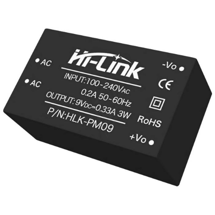 Блок питания на печатную плату Hi-Link HLK-PM09, 85-264 В (АС) 0.33 А, 9 В, корпус из поликарбоната представляет собой преобразователь из напряжения переменного тока (AC) в напряжение постоянного тока (DC) малой мощности модульного типа. Отличительными особенностями импульсных блоков питания на печатную плату являются малогабаритный корпус, высокая плотность энергии (на объем модуля), и широкий диапазон рабочей температуры - от -25 до +60 °С.