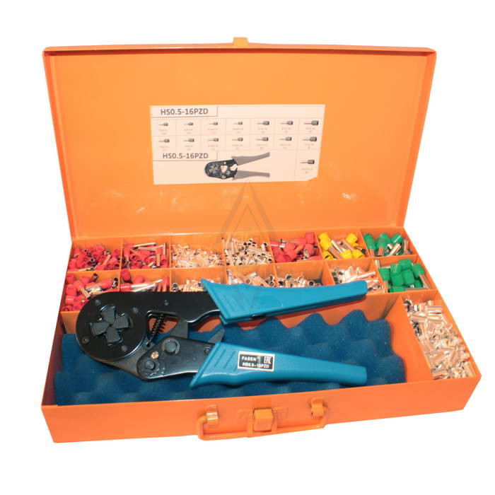 Комплект кримпера FASEN HS0.5-16PZD для обжима кабельных наконечников с набором втулок в ящике для переноски. Для типов клемм (наконечников) для обжатия: E4012; Е4018; Е10-12; Е10-18; Е16-12; E6012; Е6018; EN6012; EN6018; EN10-12; EN10-13; E16-18; EN16-12.