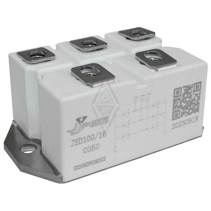 JSD100/16 трёхфазный диодный мост. Максимальное обратное напряжение (Vrrm) 1600 В. Максимальный прямой ток (If(av)) 100 А. Прямое падение напряжения (Vf) 1.35 В. Ударный ток (Ifsm) 1000 А (50 Гц, полуволна). Напряжение изоляции 3000 В переменного напряжения (1 мин).