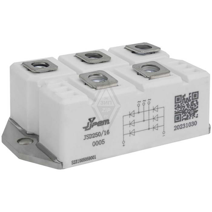 JSD250/16 трёхфазный диодный мост. Максимальное обратное напряжение (Vrrm) 1600 В. Максимальный прямой ток (If(av)) 250 А. Прямое падение напряжения (Vf) 1.35 В. Ударный ток (Ifsm) 2500 А (50 Гц, полуволна). Напряжение изоляции 3000 В переменного напряжения (1 мин).