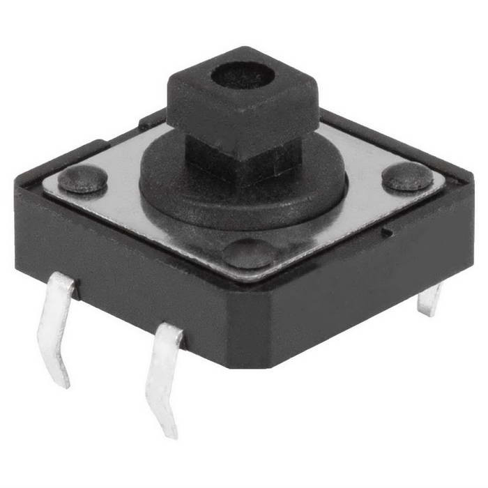 Тактовая кнопка RUICHI KAN1210-0731B, 12x12x7 мм, OFF-(ON), 50 мА, 12 В, 100 мОм, толкатель с отверстием квадратный – это разновидность простейших механических выключателей, обеспечивающая замыкание контактов (без фиксации) только при наличии давления на поверхность штока (толкателя).