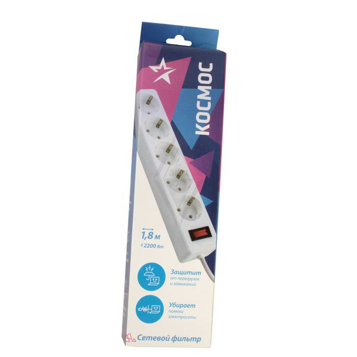 Сетевые фильтры и удлинители Космос FKsm1.8m-5g(W) КОСМОС это высококачественное устройство, предназначенное для защиты электронных приборов от скачков напряжения и коротких замыканий. Он оснащён пятью розетками и длинным кабелем (1,8 метра), что позволяет удобно подключать различные устройства на расстоянии до 1,8 метра от источника питания. Фильтр также имеет встроенную защиту от перегрузок и короткого замыкания, обеспечивая надёжную работу подключённой техники.