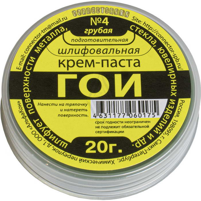 ГОИ №4 - это крем паста с шлифовальным абразивом. С помощью него удаляю царапины. Получается ровная, бархатистая, матовая поверхность. С помощью такой пасты вышлифовываются грубые царапины. Выравниваются небольшие перепады высот. Чистота поверхности идеально подходит для применения следующего номера пасты ГОИ №3