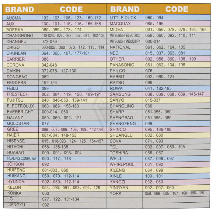 AUOMA, AUX, BOERKA, MIDEA, CHANGHONG, CHANGFU, CHIGO, CHUNLAN, CARRIER, CORONA, DAIKIN, DONGBAO, FEDDERS, FEILU, FRESTECH, FUJITSU, ELECTROLUX, EVERBRIGHT, GALANZ, COLDSTAR, GREE, HAIER, HISENSE, HITACHI, HUABAO, HUALING CONROWA, JOHSON, HUIFENG, HUIKANG, HYUNDAI, KELON, KONKA, LG, LIANGYU, LITTLE DUCK, MACQUAY, MITSUBISHI ELECTRIC, MITSUBISHI INDUSTRY, NATIONAL, NEC, OTHER, PANASONIC, PHILCO, RABBIT, RAYBO, ROWA, SAMSUNG, SANYO, SHANGLING, SHARP, SHENGBAO, SHENGFENG, SHINCO, SHUANGLU, SOVA,