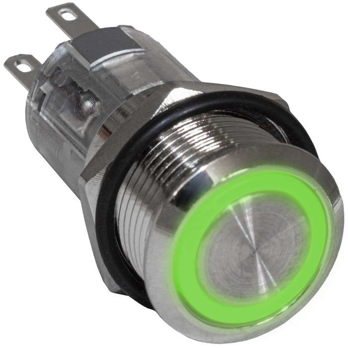 Кнопка антивандальная с подсветкой RUICHI LAS2GQF-11E/G/N, ON-(ON) без фиксации, М16, подсветка 12 В, 250 В, 3 А, 50 мОм, -25...+55 °C, корпус никелированная латунь, индикатор кольцевой, цвет индикатора зеленый максимально долговечна и надежна. Устройство способно безотказно работать при частой эксплуатации и самых тяжелых условиях. Именно поэтому такие кнопки устанавливаются в тех местах, где существует повышенный риск повреждения, например, на производственных предприятиях или объектах с большой проходимостью людей. Антивандальные кнопки часто можно встретить в лифтах, около входных дверей зданий или метрополитене.