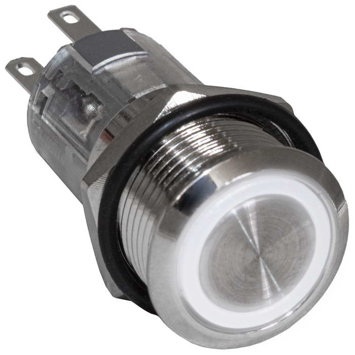 Кнопка антивандальная с подсветкой RUICHI LAS2GQF-11E/W/N, ON-(ON) без фиксации, М16, подсветка 12 В, 250 В, 3 А, 50 мОм, -25...+55 °C, корпус никелированная латунь, индикатор кольцевой, цвет индикатора белый максимально долговечна и надежна. Устройство способно безотказно работать при частой эксплуатации и самых тяжелых условиях. Именно поэтому такие кнопки устанавливаются в тех местах, где существует повышенный риск повреждения, например, на производственных предприятиях или объектах с большой проходимостью людей. Антивандальные кнопки часто можно встретить в лифтах, около входных дверей зданий или метрополитене.