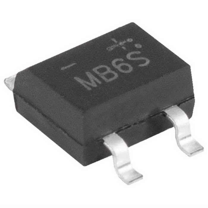 MB6S однофазный диодный мост для поверхностного монтажа в корпусе MBS. Максимальное обратное напряжение (Vrrm) 600 В, максимальный прямой ток (If(av)) 0.8 А, падение напряжения (Vf) 1.1 В. Размер (ДхШхВ) 5 х 4.1 х 2.6 мм.
