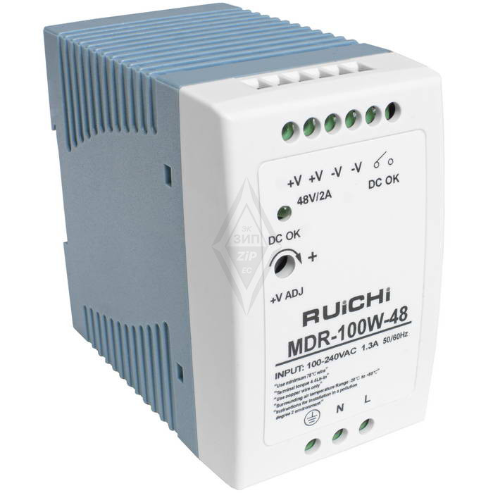 Блок питания на DIN-рейку RUICHI MDR-100-48, 100-240 В (АС) 2,08 А, 48 В, в пластиковом корпусе представляет собой преобразователь из напряжения переменного тока (AC) в напряжение постоянного тока (DC) большой мощности модульного типа. Отличительными особенностями импульсных блоков питания на на DIN-рейку является, высокая мощность и отказоустойчивость, и широкий диапазон рабочей температуры - от -30 до +70 °С.