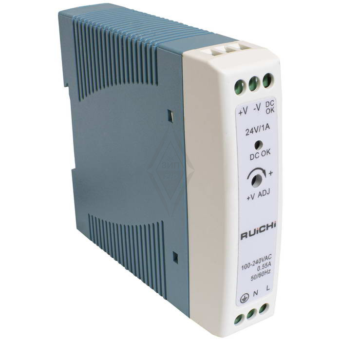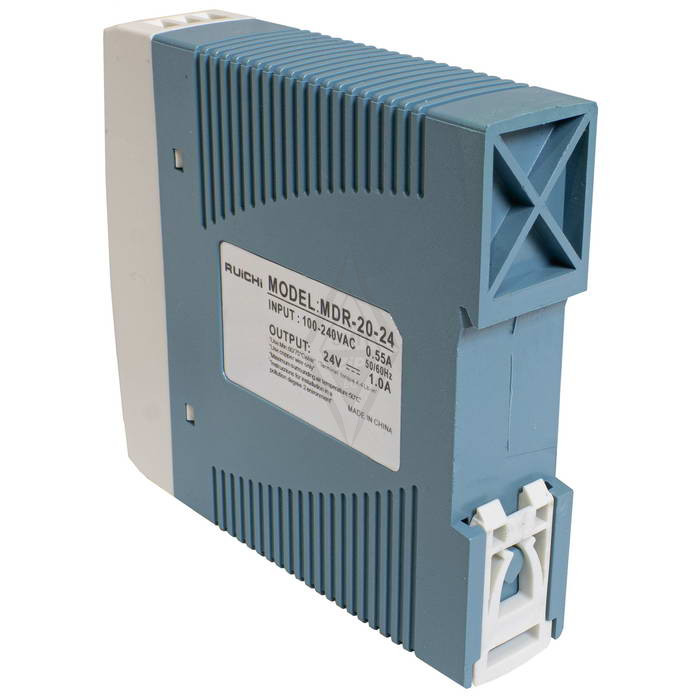 Блок питания на DIN-рейку RUICHI MDR-20-24, 100-240 В (АС) 0,83 А, 24 В, в пластиковом корпусе представляет собой преобразователь из напряжения переменного тока (AC) в напряжение постоянного тока (DC) большой мощности модульного типа. Отличительными особенностями импульсных блоков питания на на DIN-рейку является, высокая мощность и отказоустойчивость, и широкий диапазон рабочей температуры - от -30 до +70 °С.
