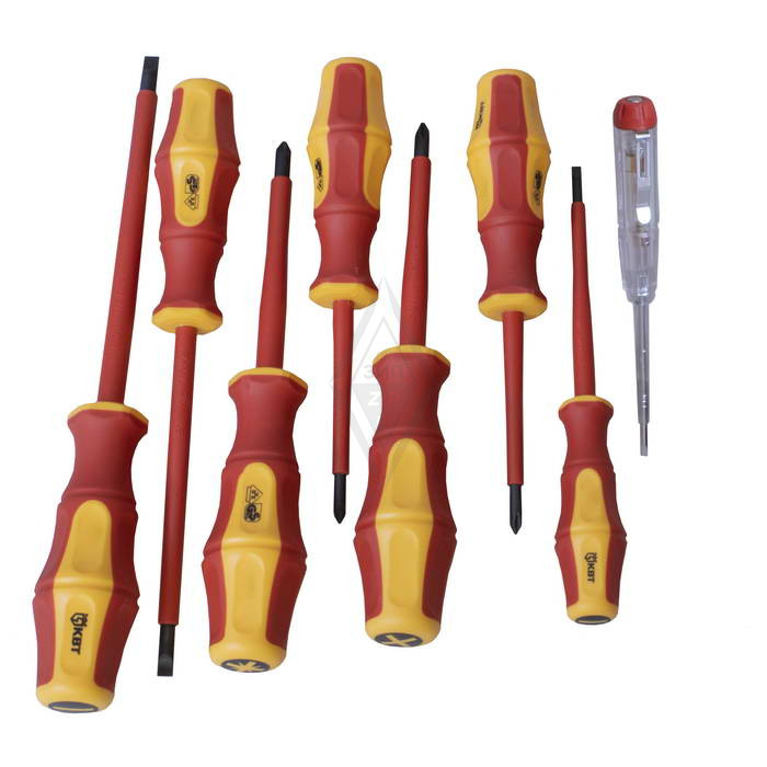 Наборы отверток Набор диэлектр. отверток НИО-08 КВТ состоит из восьми предметов и предназначен для работы с крепежом, находящимся под напряжением до 1000 В. В комплект входят отвёртки с наконечниками Phillips (PH) и Slotted (SL), а также отвёртка-индикатор. Стержни отвёрток изготовлены из хромованадиевой стали и имеют диэлектрическое покрытие. Рукоятки двухкомпонентные, с прорезиненными вставками для комфортного использования.