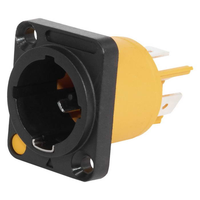 Разъем питания с фиксатором RUICHI NAC3FX-W-R, 3 контакта, 16 А, 250 В, 3 мОм, на панель, крепление корпуса винтовое, корпус PA66, черный/желтый - это стандартные в отрасли разъемы для подключения усилителей/громкоговорителей/звукового и студийного оборудования. Разъем работает в сети переменного тока и является 3-х полюсным. Кабельный разъем был разработан для работы с высокими токами, до 20 А. Разъем имеет фиксатор, что обеспечивает надежное соединение.