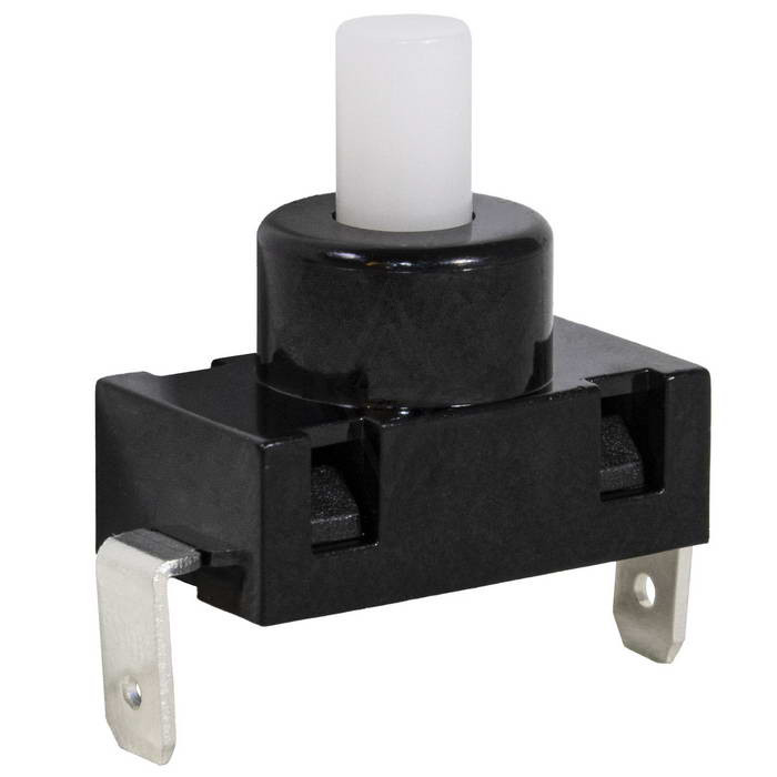 Кнопочный переключатель RUICHI PBS101B, 2 контакта вертикально вниз, корпус черный, кнопка белая – это коммутационное устройство с механизмом нажимного действия и обратным приводом, которое предназначено для размыкания и замыкания электрической цепи.