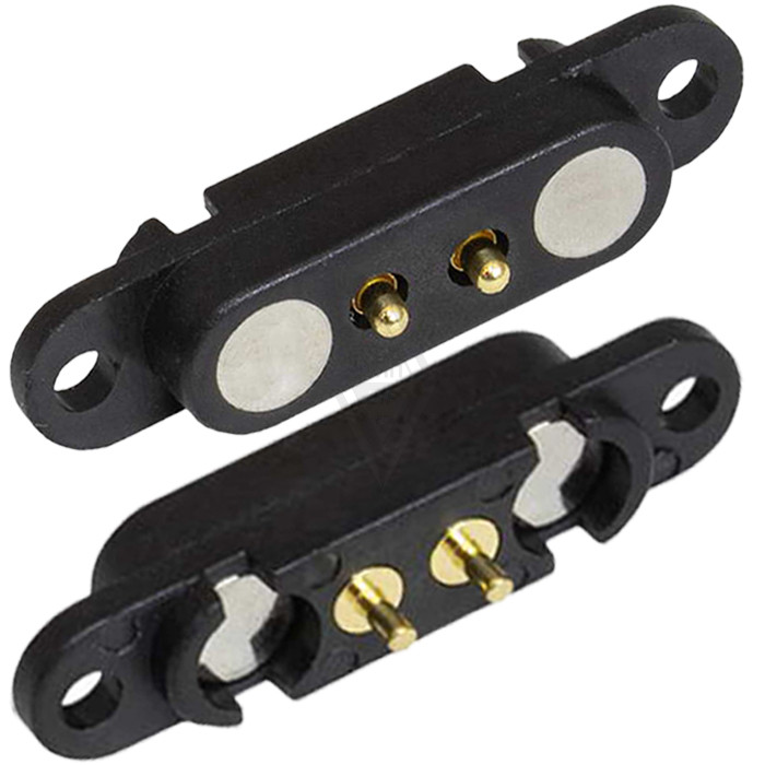 Разъем питания магнитный подпружиненный RUICHI POGO pin, 2 контакта, комплект male-female, шаг 2.54 мм, с фланцами для крепления к панели мобильных устройств с постоянным током.