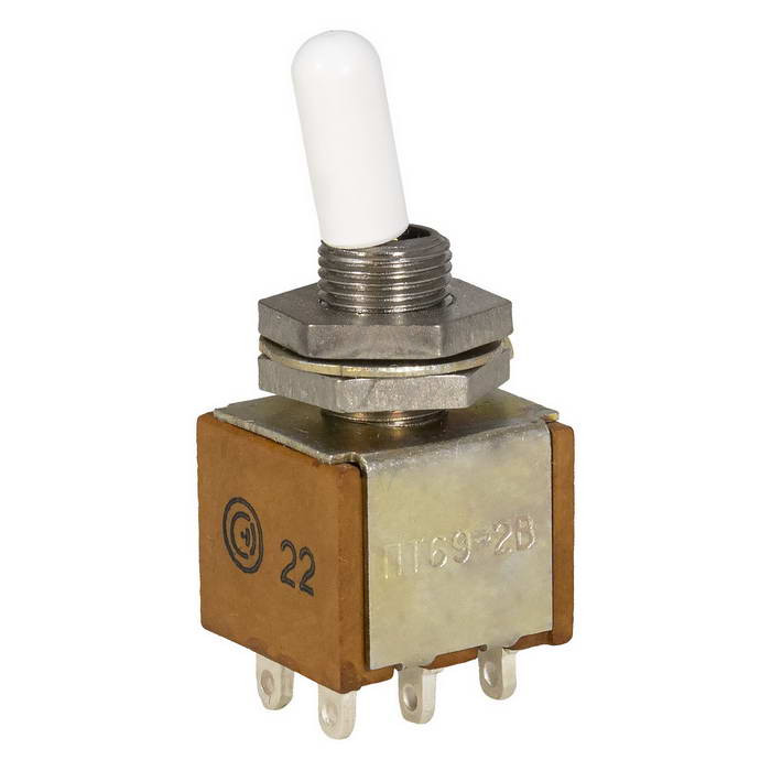 Тумблеры ПТ69-2КВ СЗР это миниатюрный переключатель, предназначенный для коммутации электрических цепей постоянного (DC) и переменного (AC) тока в радиоэлектронной аппаратуре различного назначения. Он изготавливается в климатическом исполнении «В» и соответствует техническим условиям АГ0.360.408 ТУ. Тумблер имеет массу 9 грамм, усилие переключения от 1,2 до 10 Н и сопротивление электрического контакта не более 0,05 Ом. Он работает в диапазоне рабочих температур от -60 °C до +85 °C и имеет срок сохраняемости 12 лет (для изделий с приёмкой «СКК») или 20 лет