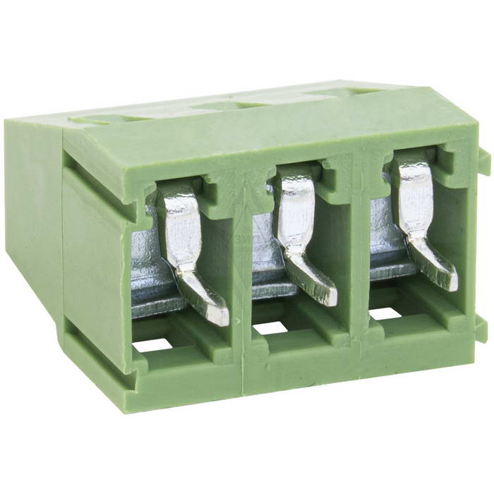 Винтовой модульный клеммный блок RUICHI RG128-5.0-03P, на плату, 3 контакта, шаг 5.00 мм - разновидность разъемного соединения проводов к печатным платам. Представляет собой группу винтовых или пружинных зажимов, собранную на пластиковом основании и снабженную контактами для пайки на печатную плату. Служит удобным и организованным способом выполнения электрических соединений, будь то распределение электроэнергии, маршрутизация сигналов или проводка управления.