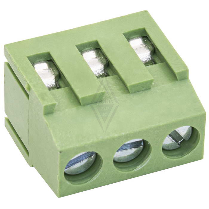 Винтовой модульный клеммный блок RUICHI RG500-5.0-03P, на плату, 3 контакта, шаг 5.00 мм - разновидность разъемного соединения проводов к печатным платам. Представляет собой группу винтовых или пружинных зажимов, собранную на пластиковом основании и снабженную контактами для пайки на печатную плату. Служит удобным и организованным способом выполнения электрических соединений, будь то распределение электроэнергии, маршрутизация сигналов или проводка управления.