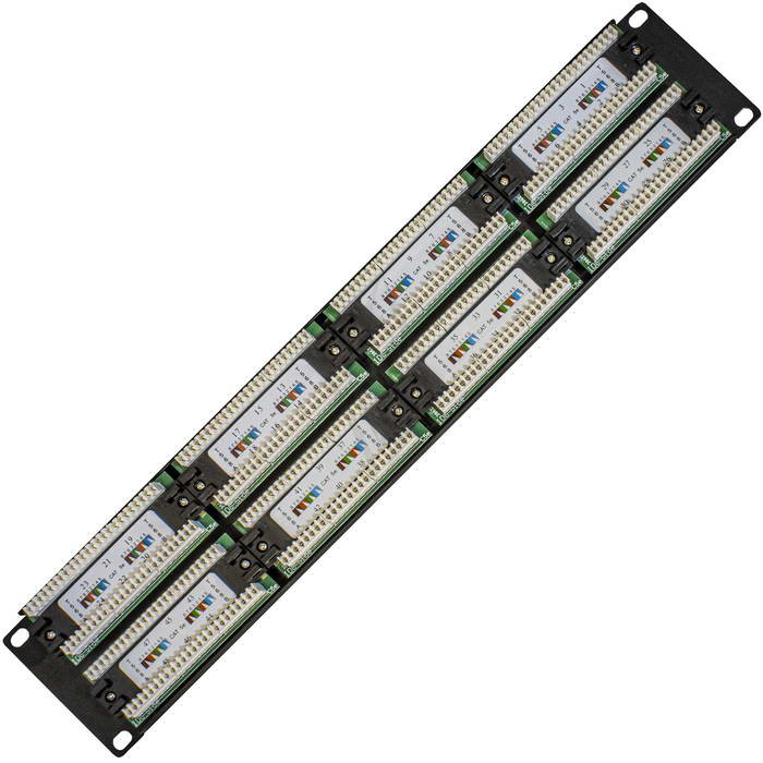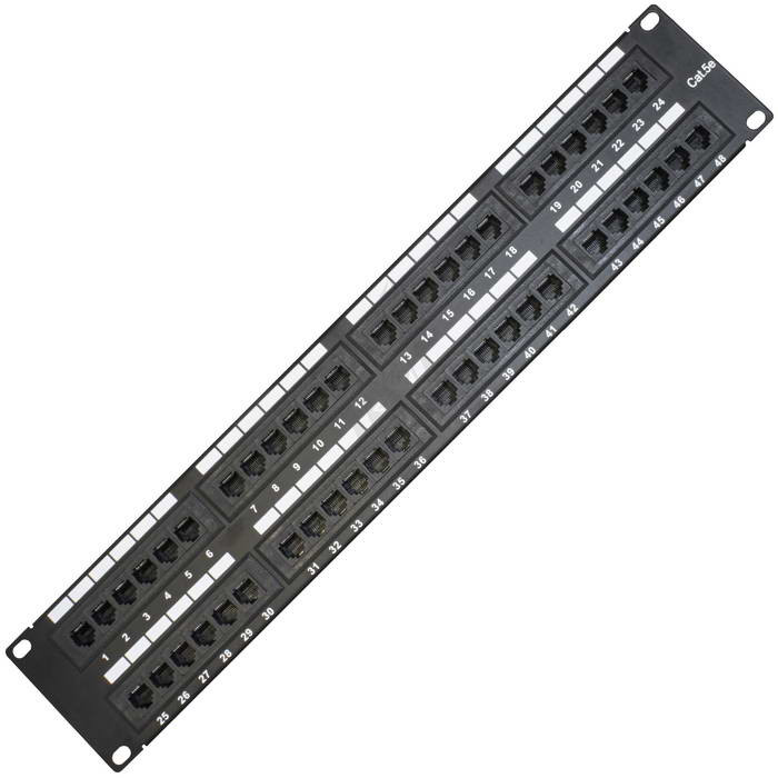 Патч-панель RUICHI RH-PP2U48U5E предназначена, для коммутации активного сетевого оборудования с портами рабочих компьютеров (или другого оборудования), а также для использования в паре с другой патч-панелью (так называемое двойное представление портов), где первая представляет порты активного сетевого оборудования, а вторая – порты присоединяемых устройств (компьютеров, телефонов, сетевых принтеров и т.п.). Разъемы пронумерованы, имеют площадки для дополнительной маркировки. Контакты, расположенные на обратной стороне также имеют цифровую и цветовую маркировку.