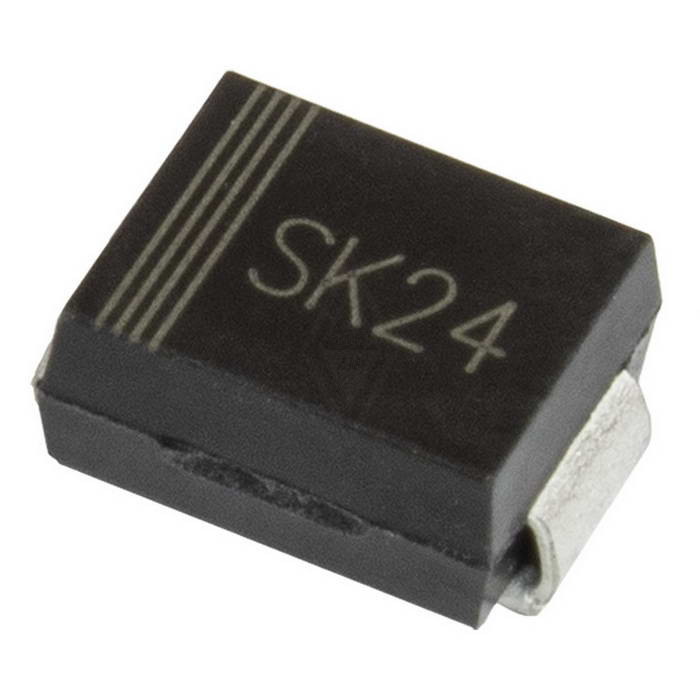 SK24 диод Шоттки для поверхностного монтажа в корпусе DO-214AA (SMB). Максимальное обратное напряжение 40 Вольт, максимальный прямой ток 2 Ампер, прямое падение напряжения 0.55 Вольт.