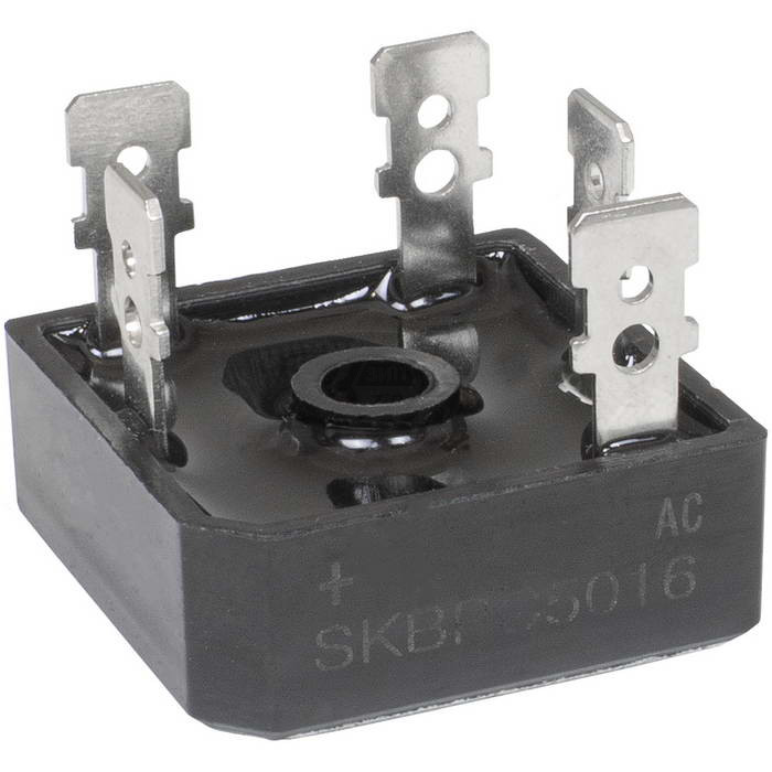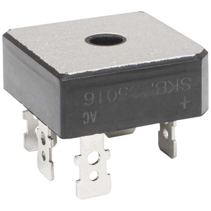 SKBPC5016 трехфазный диодный мост. Тип контактов - клеммы (faston). Максимальное обратное напряжение (Vrrm) 1600 В, максимальный прямой ток If(av) 50 А. Падение напряжения (Vf) 1.05. Напряжение изоляции 2000 В. Размеры 28.5х28.5х11 мм