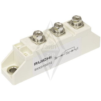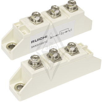 Силовой диодный модуль серии SKKD RUICHI, 12 класс по напряжению. полумостовой диодный модуль. Максимальное обратное напряжение (Vrrm) 1200 В, максимальный средний прямой ток (If(av)) 100 А, прямое падения напряжения (Vfm) 1.35 В, напряжение изоляции 2500 В (1 мин).