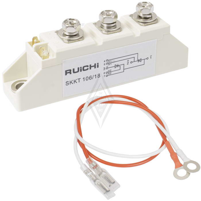Тиристорный модуль SKKT106/18 для монтажа на охладитель в корпусе 93 х 20 х 30 мм. Внутренняя схема - полумост. Обратное напряжение Vdrm/Vrrm 1800 В, средний выпрямленный ток It(av) 110 А. Ударный ток Itsm 2.4 кА. Стойкость к dV/dt 800 В/мкс. Напряжение изоляции 2.5 кВ. Диапазон рабочих температур -40…+125 °С