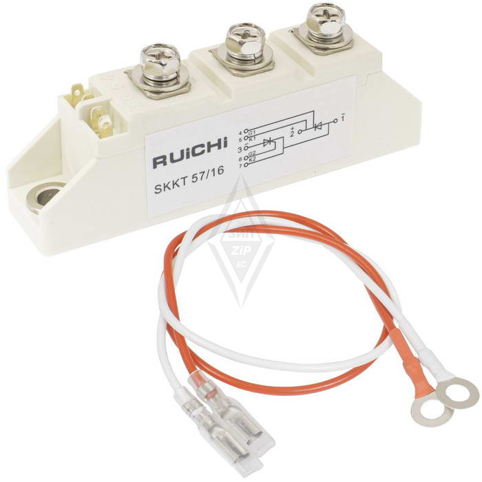 Тиристорный модуль SKKT57/16 для монтажа на охладитель в корпусе 93 х 20 х 30 мм. Внутренняя схема - полумост. Обратное напряжение Vdrm/Vrrm 1600 В, средний выпрямленный ток It(av) 55 А. Ударный ток Itsm 1.25 кА. Стойкость к dV/dt 800 В/мкс. Напряжение изоляции 2.5 кВ. Диапазон рабочих температур -40…+125 °С