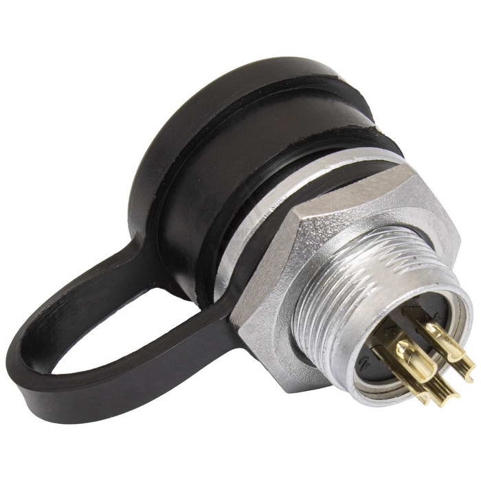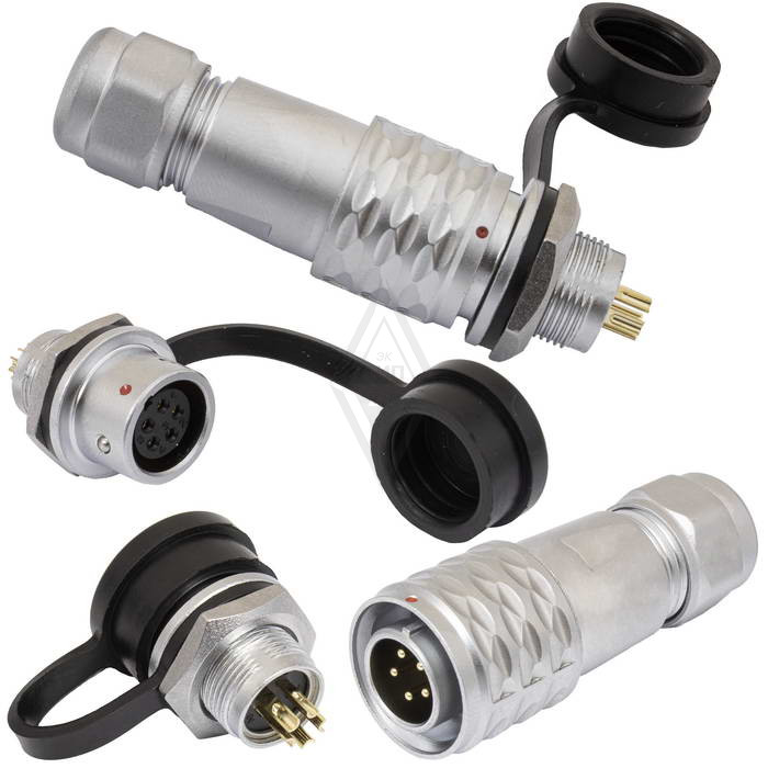 Комплект быстросъемного разъема push-pull кабель-блок RUICHI SR12-12/MF5P, 5-ти контактный, диаметр кабеля 4-6,5 мм, 5 А, IP67, -20…+85°С, корпус хромированная латунь, представляет собой металлический герметичный круглый соединитель с быстросъемным push-pull сочленением. Данное соединение обеспечивает надежность сочленения ответных частей в отличие от обычного резьбового соединения. Главная особенность разъемов – работоспособность в любых условиях эксплуатации.