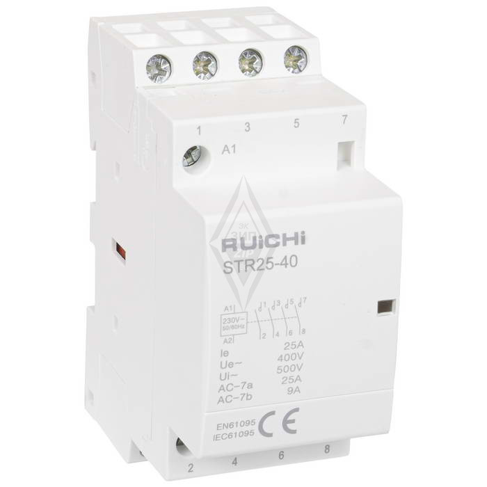 Модульный электронный контактор RUICHI STR25-40 используется для надежного управления электрическими нагрузками в сетях до 500 В. Оснащен четырьмя нормально открытыми контактами (4NO), рассчитанными на номинальный ток 25 А и катушку управления на 230 В AC. Благодаря категории применения AC-7a/AC-7b контактор подходит для коммутации как резистивных, так и индуктивных нагрузок. Удобный монтаж на DIN-рейку 35 мм, компактные размеры (высота 81 мм, глубина 68 мм, ширина 36 мм) и степень защиты IP20 обеспечивают простоту установки и безопасность эксплуатации. Отличное решение для автоматизации освещения, систем отопления и управления различным электрооборудованием.