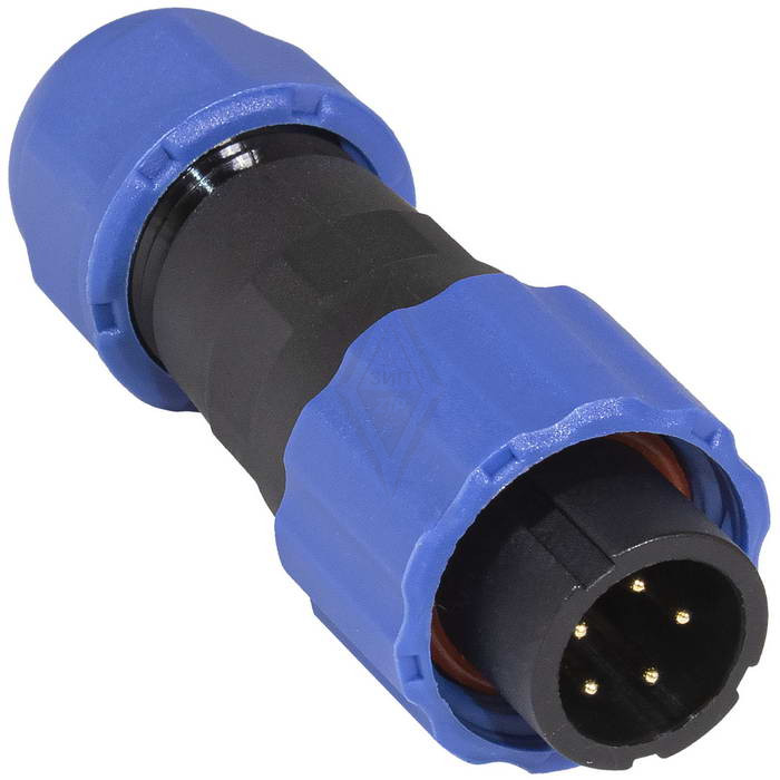 Герметичный разъем (комплект) с заглушкой SZC 28 5P-M-FB, вилка-розетка, 5 контактов, диаметр входящего кабеля 6.5 мм, IP68, 5 А, 250 В, корпус PA66 UL94V-0, черный, накидные гайки синие является пылезащищенным и влагозащищенным. Герметичный разъем соответствует высокой степени защиты, что гарантирует работу разъемов при длительном погружении в воду (более 30 минут) на глубину больше 1 м.