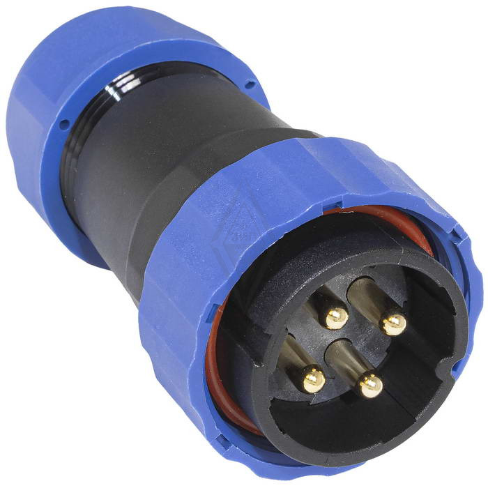Герметичный разъем с заглушкой SZC 28 4P-M-FB, вилка-розетка, 4 контакта, диаметр входящего кабеля 15 мм, IP68, 5 А, 250 В, корпус PA66 UL94V-0, черный, накидные гайки синие является пылезащищенным и влагозащищенным. Герметичный разъем соответствует высокой степени защиты, что гарантирует работу разъемов при длительном погружении в воду (более 30 минут) на глубину больше 1 м.