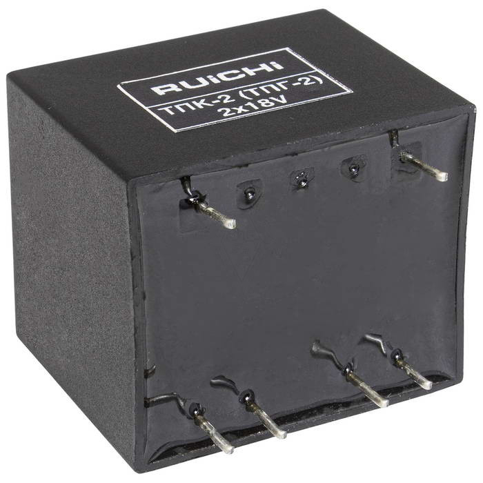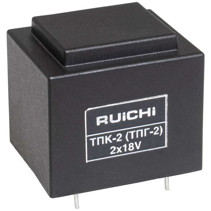 Трансформатор питания герметизированный RUICHI ТПК-2, магнитоотвод ЕI30х17, 50 Гц, 25.5х27х32 мм, понижение с 220 В до 2х18 В, 0.17 А, 2,5 Вт, для печатного монтажа используется в сети переменного тока 220 В с частотой 50 Гц и предназначен для понижения напряжения до 6 В, 9 В, 12 В, 24 В или 2х12 В. Номинальная мощность при этом варьируется от 1 Вт до 180 Вт.