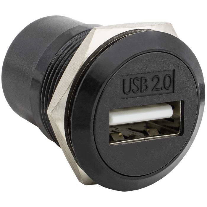 Панельный модуль (переходник) передачи данных USB RUICHI USB 2.0 A(F)-A(F) PN, прямой порт USB, 5В, 5А, крепление гайка с резьбой, корпус пластиковый, цвет черный - универсальная последовательная шина, отвечающая за передачу данных между устройствами через прямой порт USB 2.0.