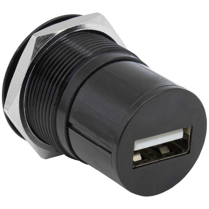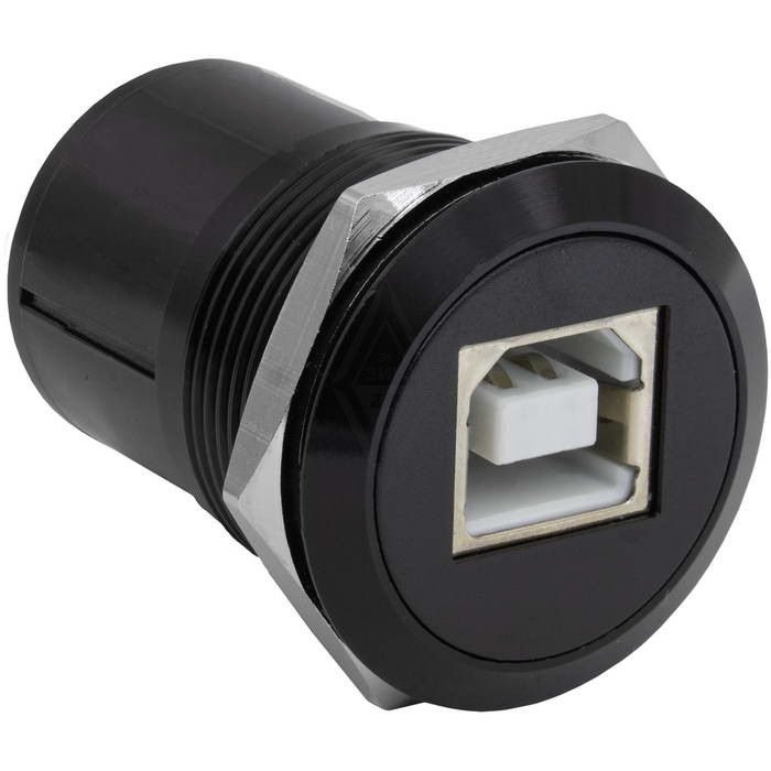 Панельный модуль (переходник) передачи данных USB RUICHI USB 2.0 B(M)-A(F) PN, прямой порт USB, 5В, 0.5 А, крепление гайка с резьбой, корпус пластиковый, цвет черный - универсальная последовательная шина, отвечающая за передачу данных между устройствами через порт USB B(M)-A(F)